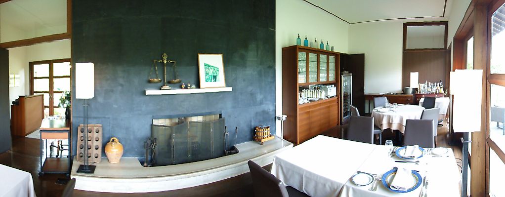 白壁に暖炉のある黒い壁に椅子・テーブルとシンプルで天井も高くとても気持ちがいい。
