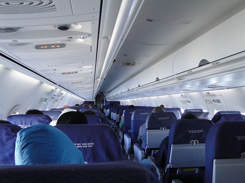 ハワイアン航空機の機内、搭乗率60%くらい。