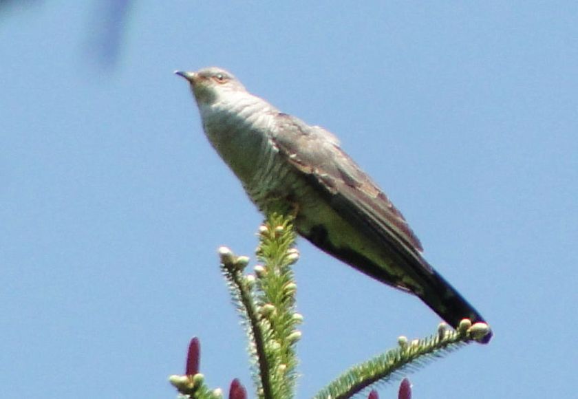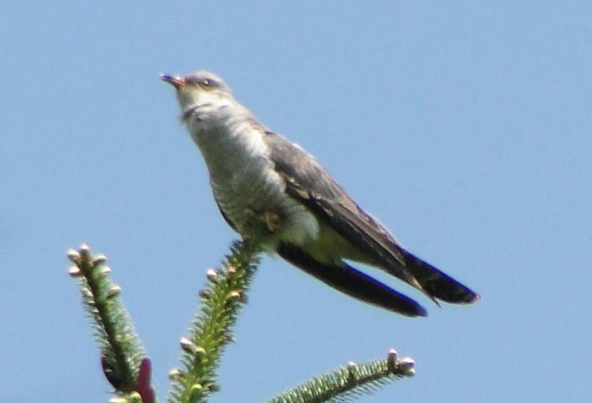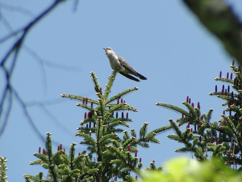 見上げてみるともみの木の頂にカッコウが。去年は7月か8月に2・3度しか鳴き声を聴いたことがなかったのですが今年はこんなに早く飛来してくるとは?