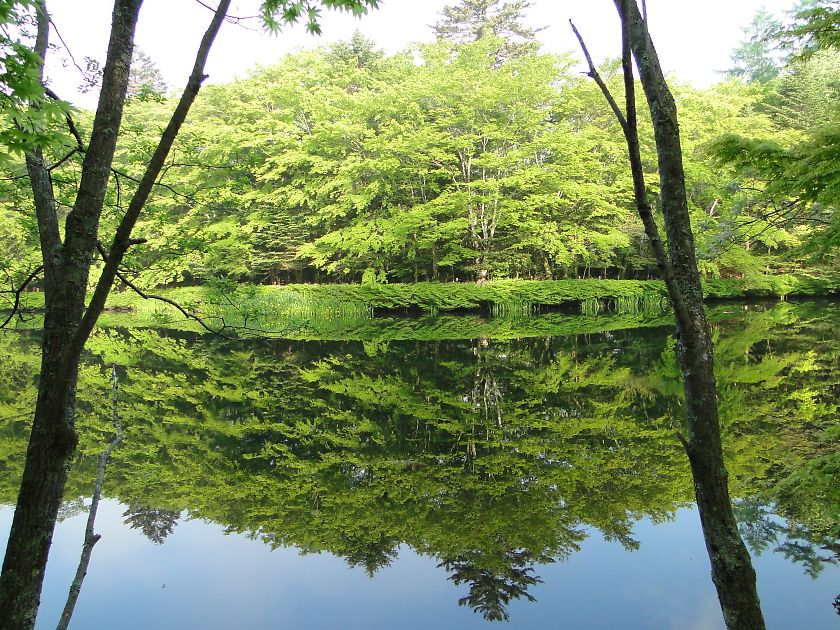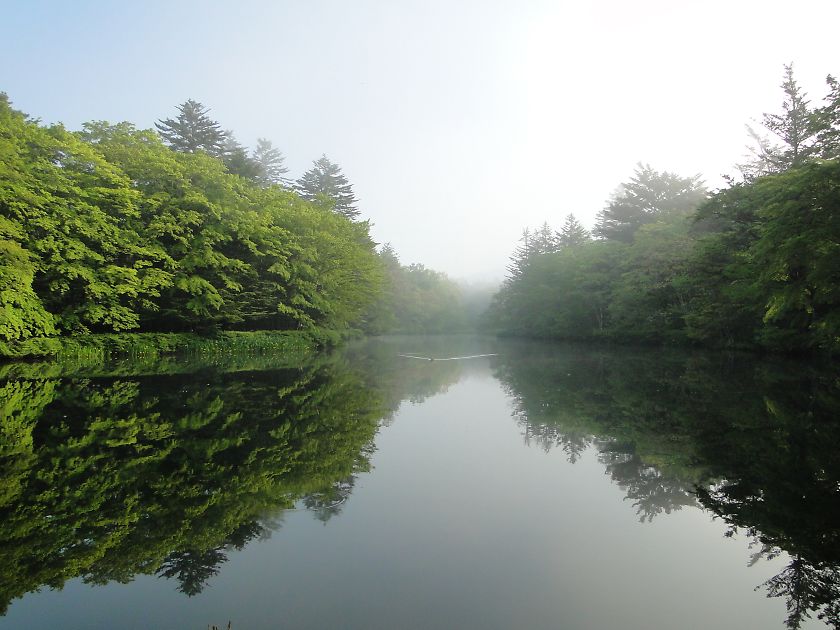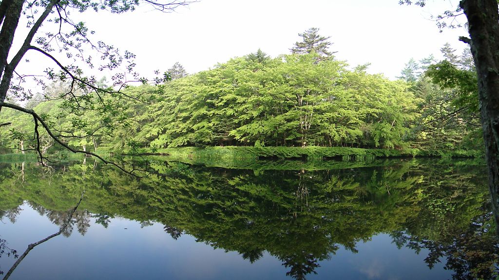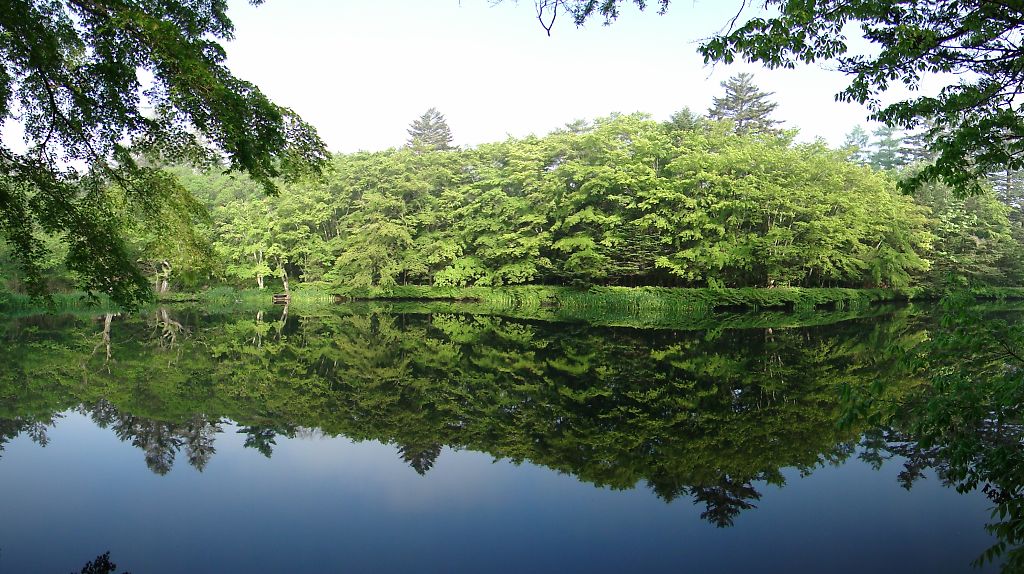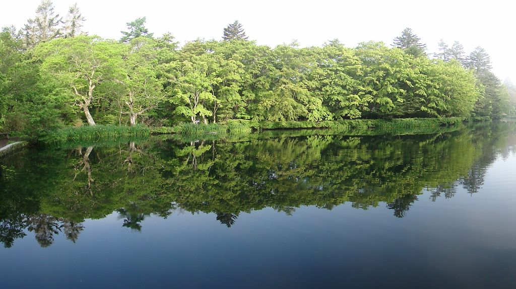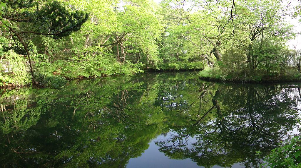 この日の朝は風もなく池面が鏡のように緑の木々を映していました。