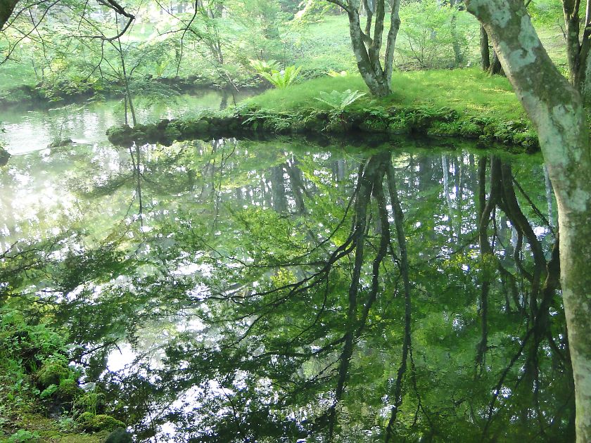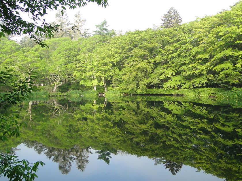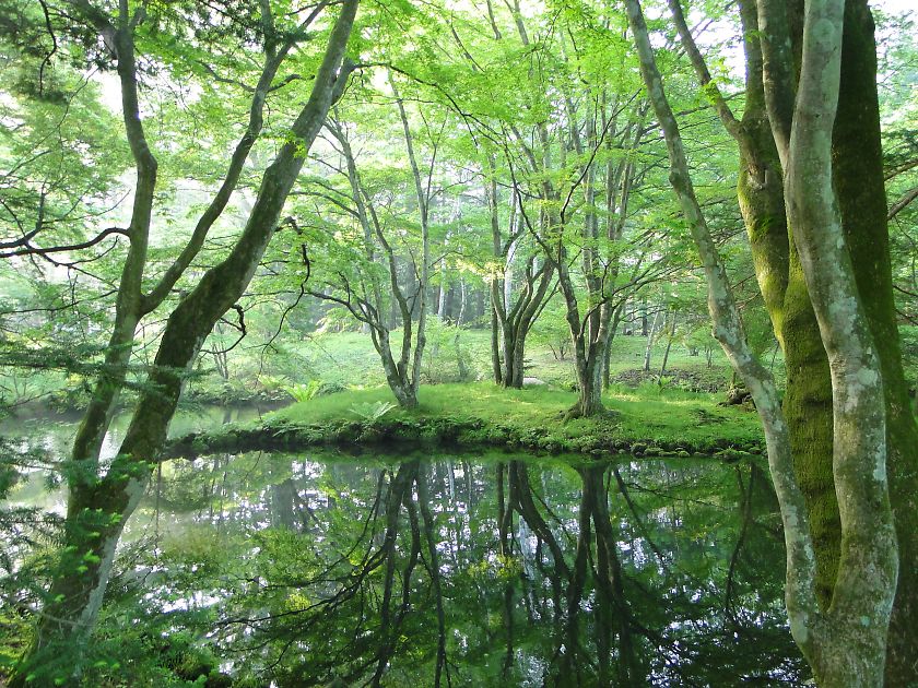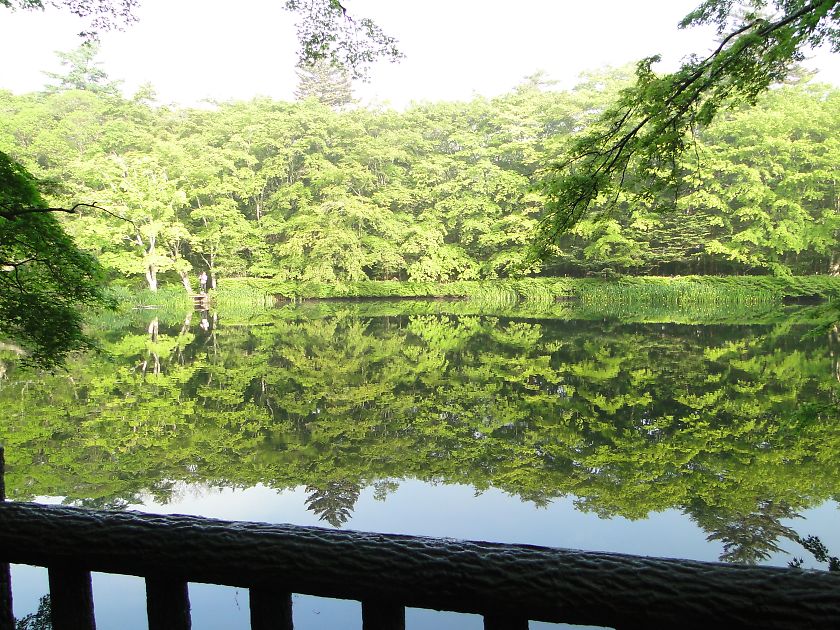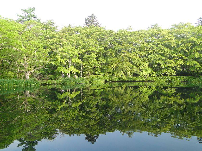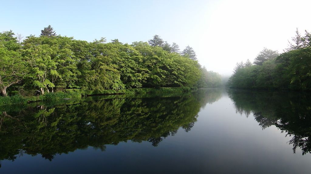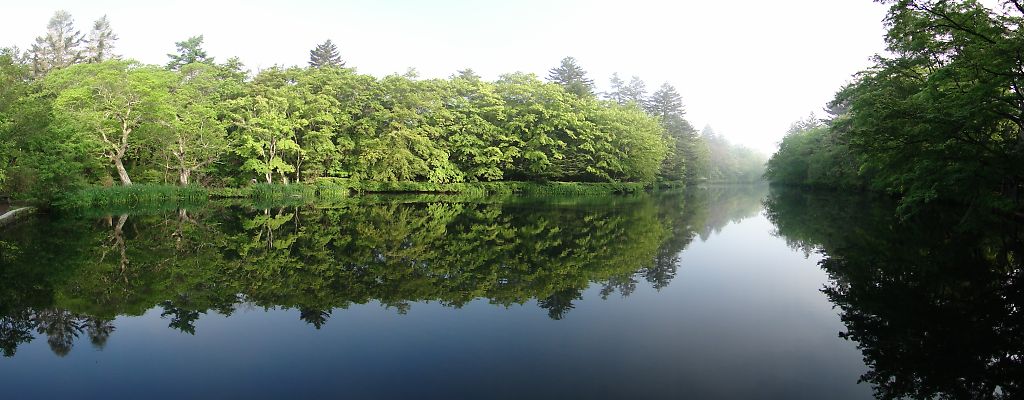 この日の朝は風もなく池面が鏡のように緑の木々を映していました。