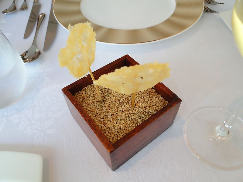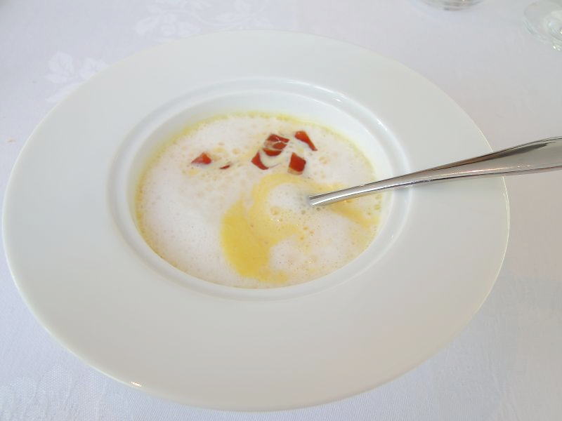 スープ:ニンジンのスープ、カプチーノ仕立て、生ハムのチュイル。