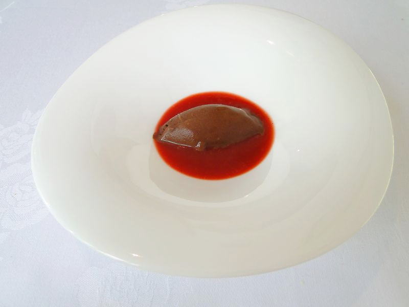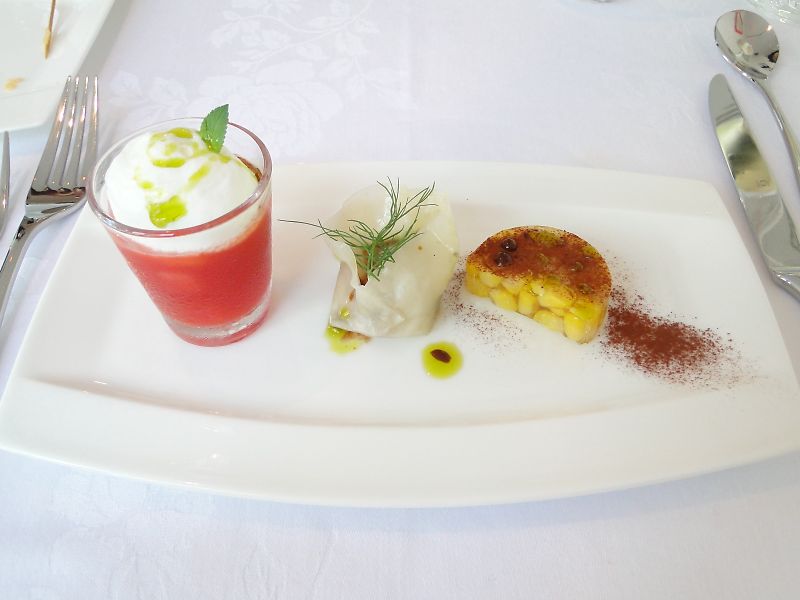 前菜:トマトとスイカのジュレ、海老のラビオリ、カカオパウダーのとうもろこしのテリーヌ