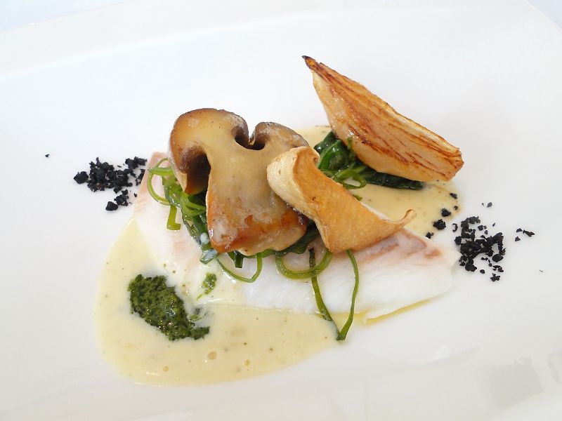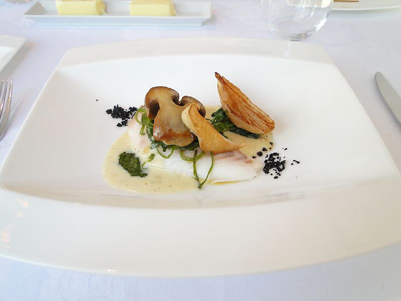 主菜:明石直送の鯛、オリーブのプードルと野菜のポアレ、バジルのソー。