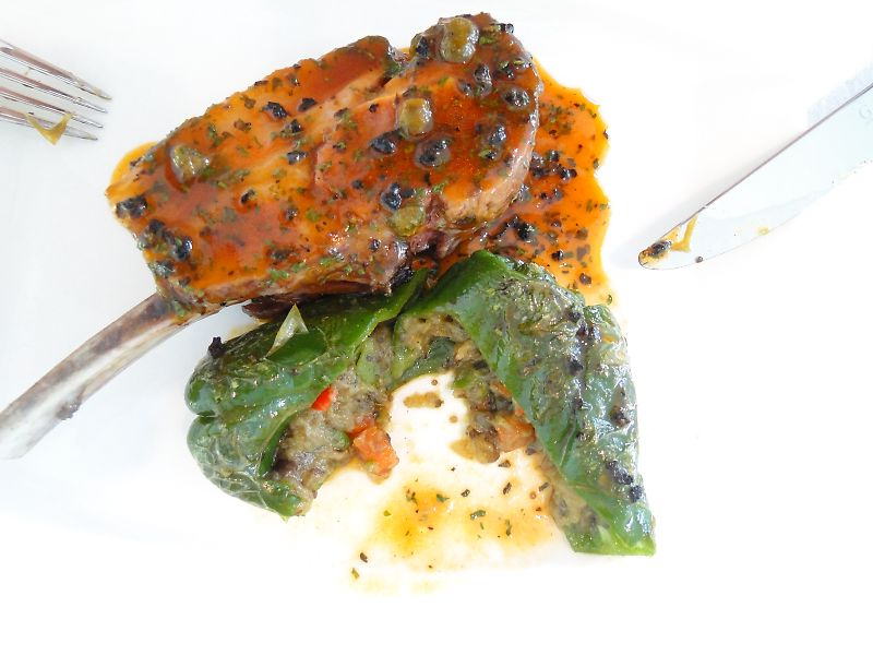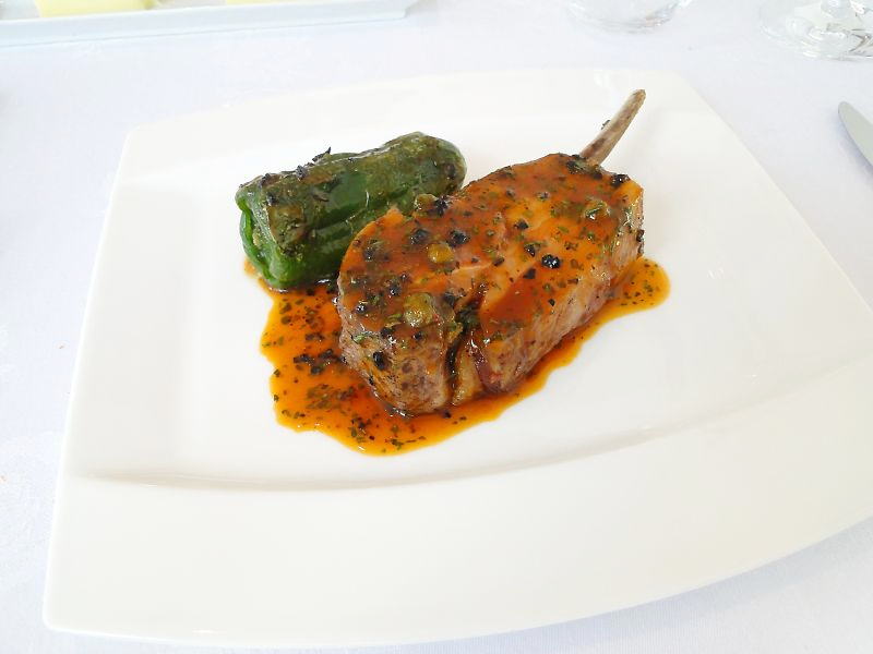 主菜:オーストラリア産子羊のロティー。キャビアオーベルジーヌと夏野菜を詰めたピーマン。子羊の肉汁・オリーブ・トマトケッパーで。