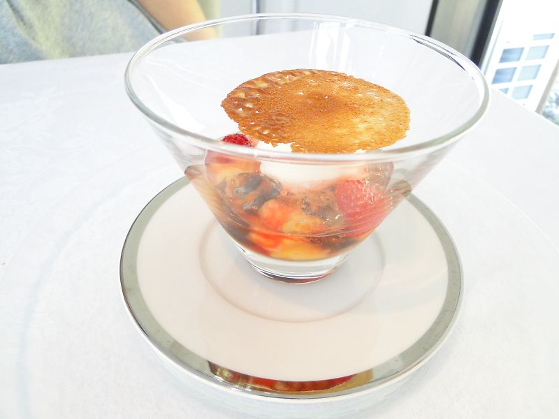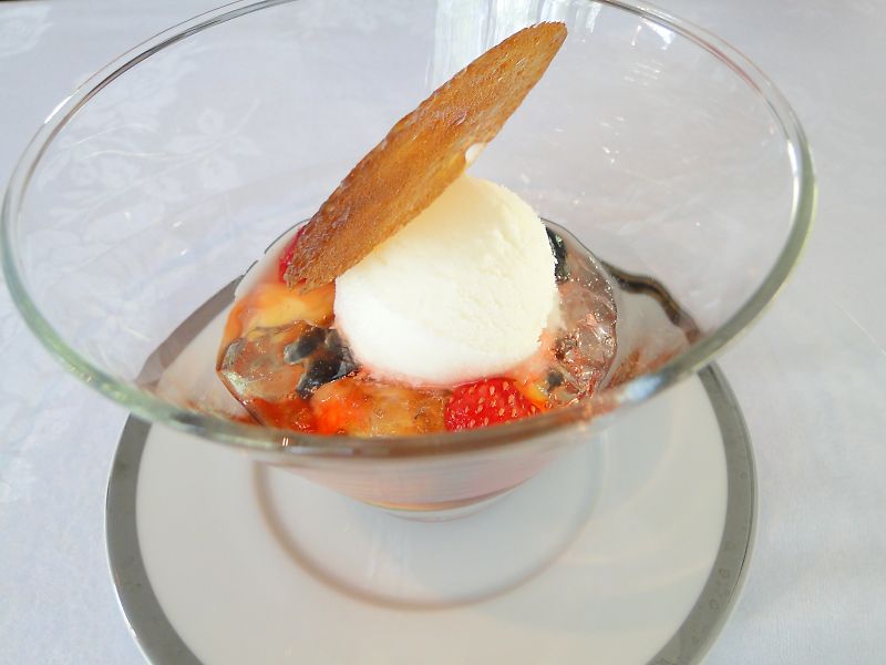 フルーツのサラダ、白ワインのジュレ、ヨーグルトのソルべ、ハチミツのチュイル